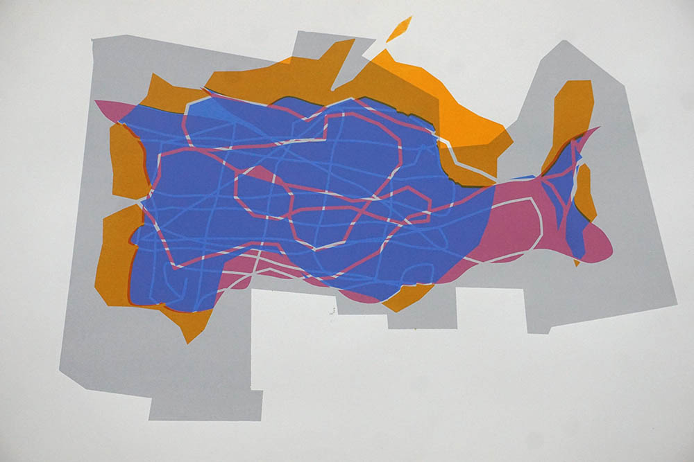 Large (A1) screenprints. Either 3 or 4 layers. Base layer is taken from maps of the Square, basically the shape of the Square as defined by the surrounding architecture or roads. The second layer is taken from the GPS pattern of my walk in the square in March 2018, when no events were taking place, so possible to do a very structured walk in a grid pattern through the square. The third and fourth layers are based on GPS data from attempting the same walk whilst an event was taking place in the Square. The overall combination of layers represents a picture of how the availability of the space is changed by these events, or how the space has been appropriated, as evidenced by my own physical engagement with the space through walking.
