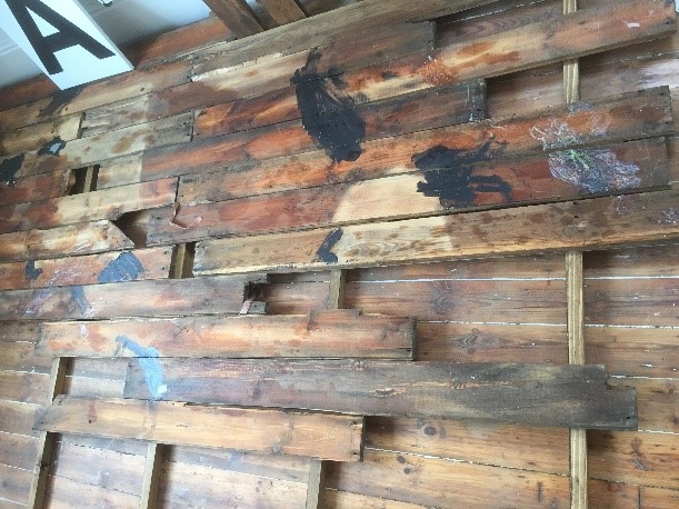 The work that emerged included a reconstruction of a section of the wooden floor of the event space using reclaimed floorboards. These were sanded and stained to match the floor as closely as possible.